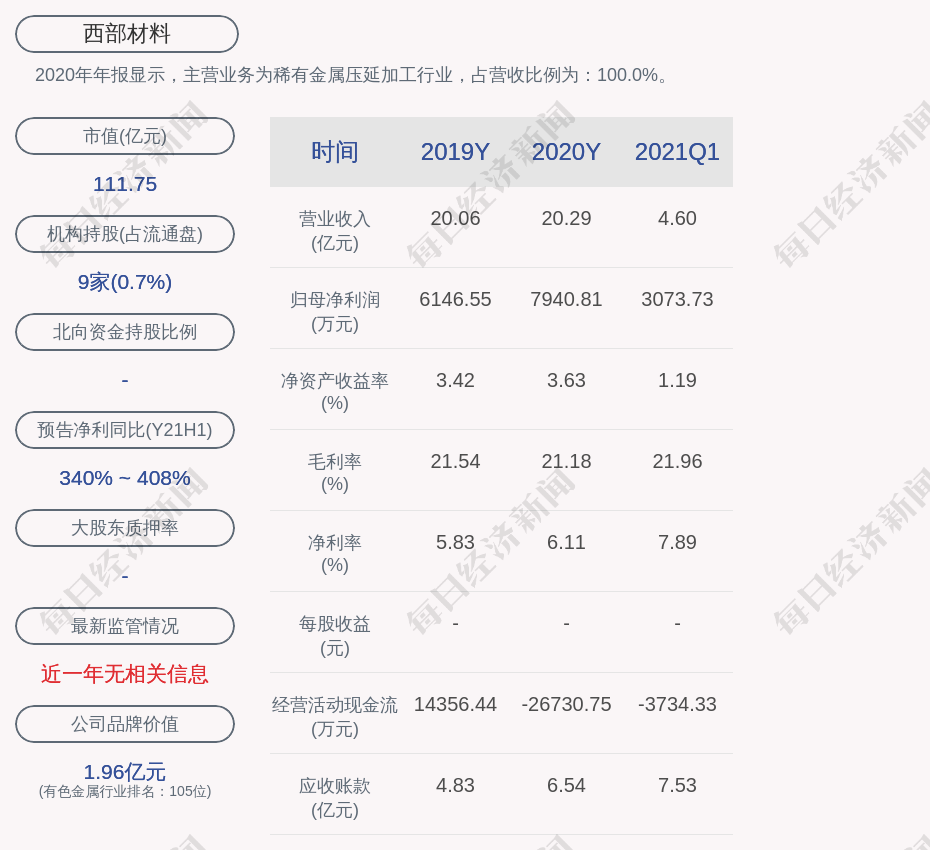 2020年年报显示,西部材料的主营业务为稀有金属压延加工行业,占营收比例为:100.0%。