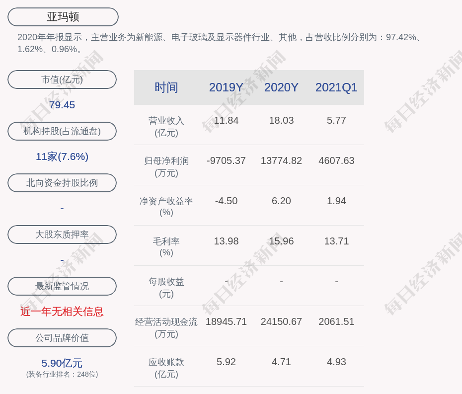 2020年年报显示,亚玛顿的主营业务为新能源、电子玻璃及显示器件行业、其他,占营收比例分别为:97.42%、1.62%、0.96%。