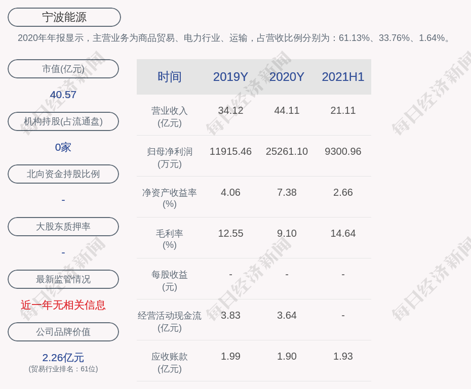 2020年年报显示,宁波能源的主营业务为商品贸易、电力行业、运输,占营收比例分别为:61.13%、33.76%、1.64%。