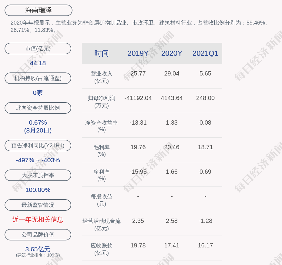 2020年年报显示,海南瑞泽的主营业务为非金属矿物制品业、市政环卫、建筑材料行业,占营收比例分别为:59.46%、28.71%、11.83%。