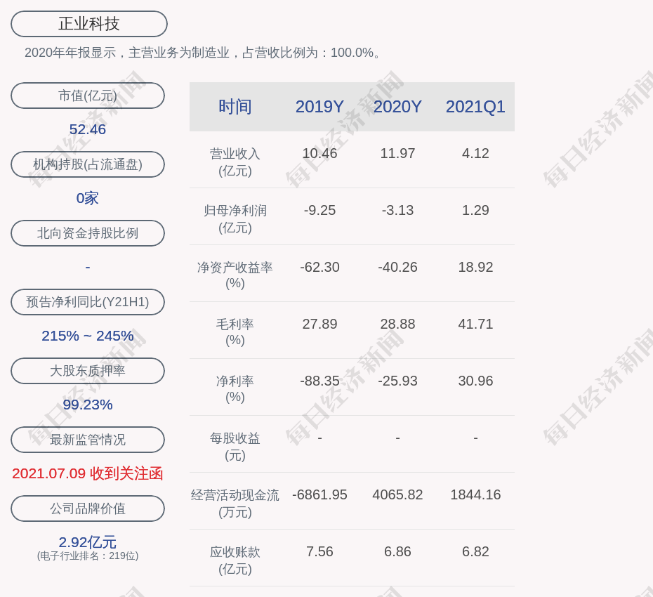 2020年年报显示,正业科技的主营业务为制造业,占营收比例为:100.0%。