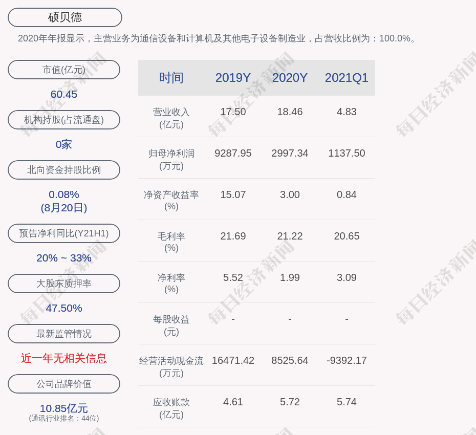 2020年年报显示,硕贝德的主营业务为通信设备和计算机及其他电子设备制造业,占营收比例为:100.0%。