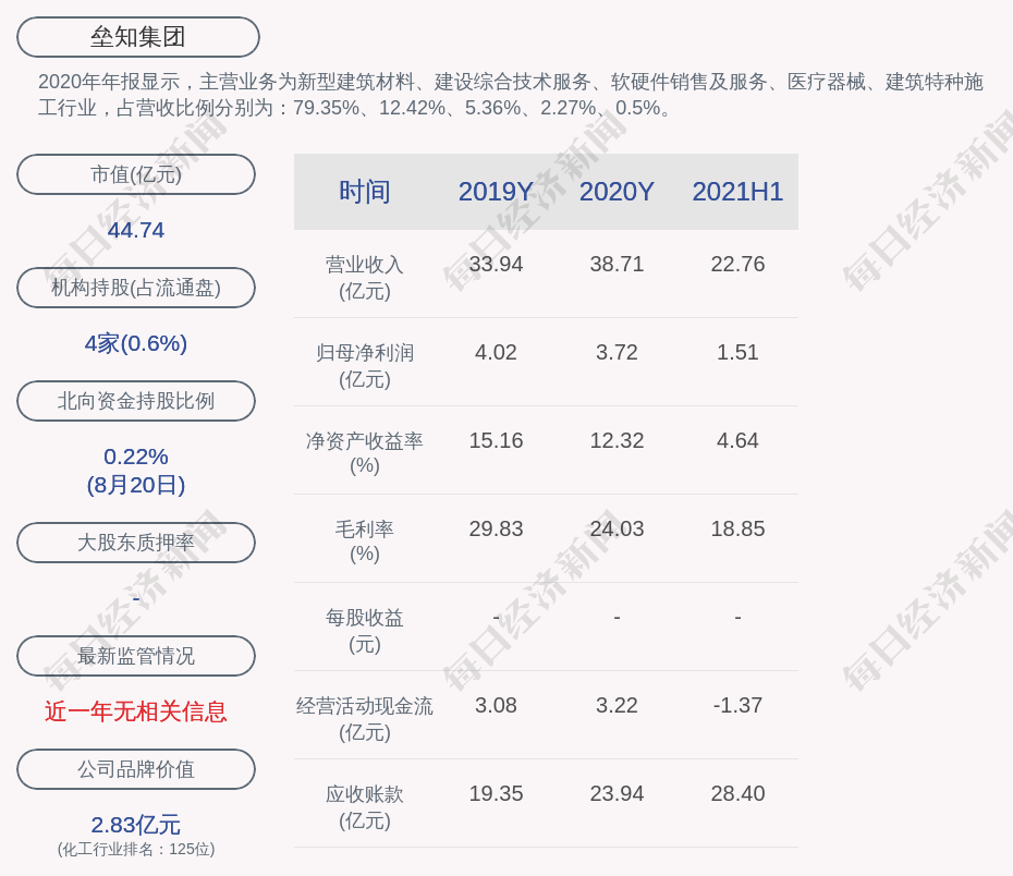 2020年年报显示,垒知集团的主营业务为新型建筑材料、建设综合技术服务、软硬件销售及服务、医疗器械、建筑特种施工行业,占营收比例分别为:79.35%、12.42%、5.36%、2.27%、0.5%。