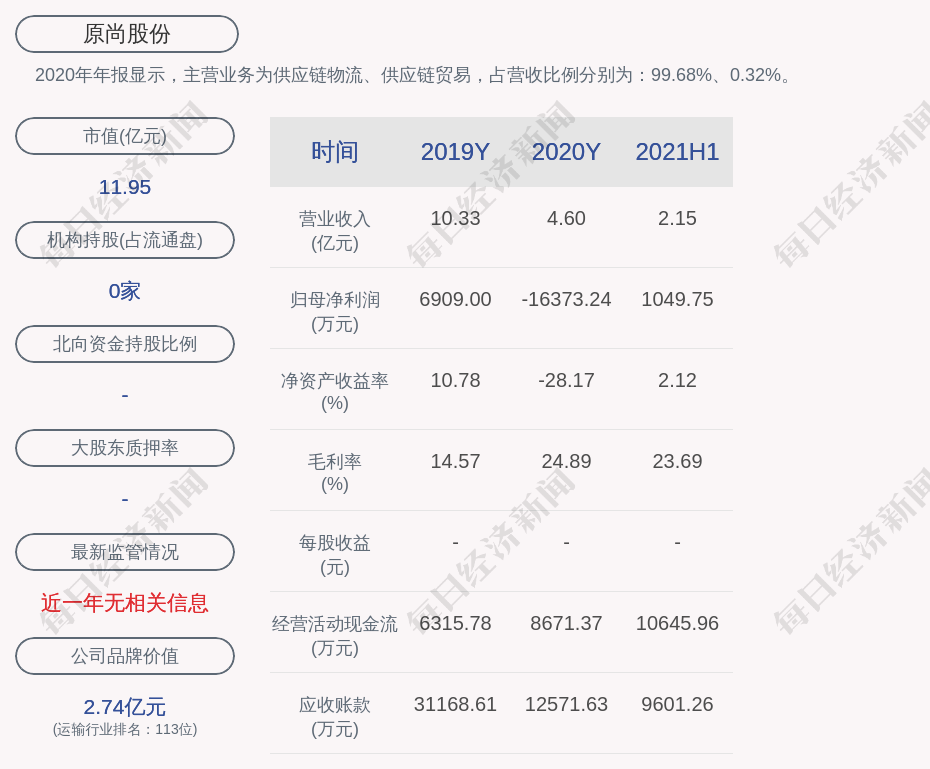 2020年年报显示,原尚股份的主营业务为供应链物流、供应链贸易,占营收比例分别为:99.68%、0.32%。
