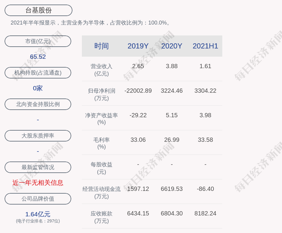 2021年半年报显示,台基股份的主营业务为半导体,占营收比例为:100.0%。