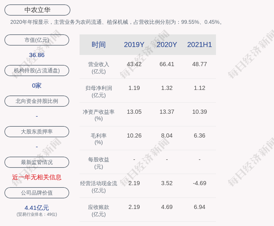 2020年年报显示,中农立华的主营业务为农药流通、植保机械,占营收比例分别为:99.55%、0.45%。