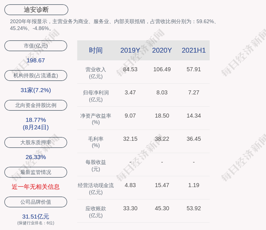 2020年年报显示,迪安诊断的主营业务为商业、服务业、内部关联抵销,占营收比例分别为:59.62%、45.24%、-4.86%。