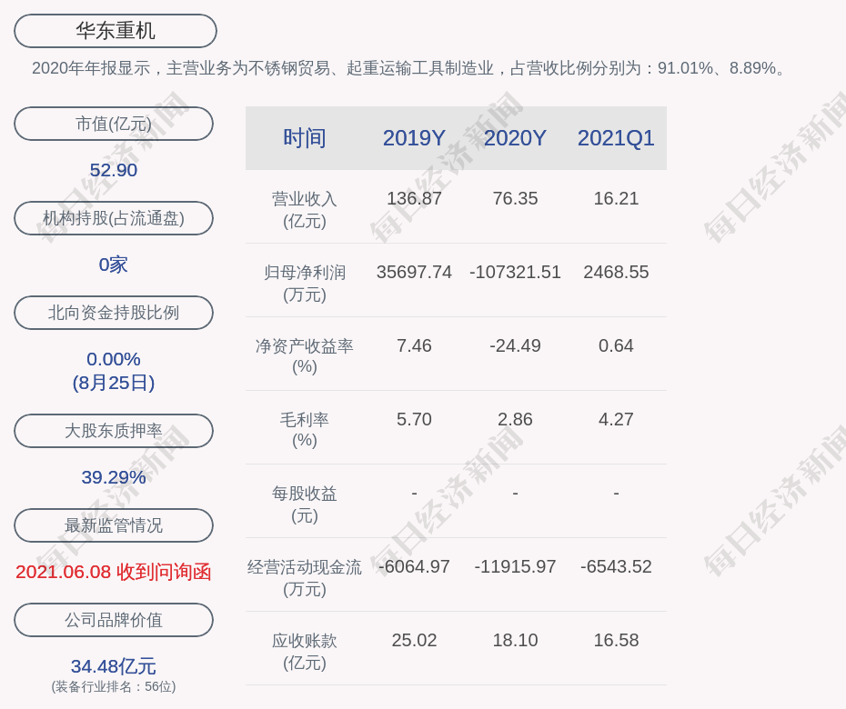2020年年报显示,华东重机的主营业务为不锈钢贸易、起重运输工具制造业,占营收比例分别为:91.01%、8.89%。