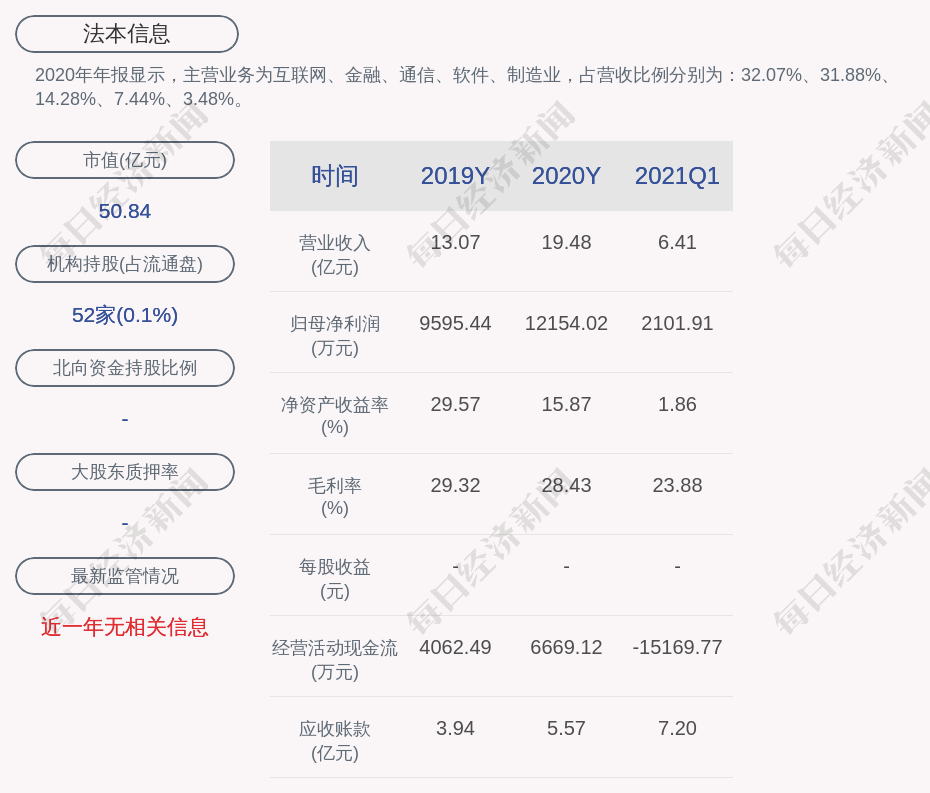 2020年年报显示,法本信息的主营业务为互联网、金融、通信、软件、制造业,占营收比例分别为:32.07%、31.88%、14.28%、7.44%、3.48%。