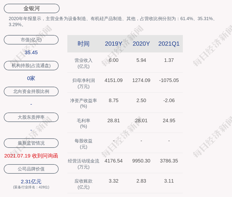 2020年年报显示,金银河的主营业务为设备制造、有机硅产品制造、其他,占营收比例分别为:61.4%、35.31%、3.29%。