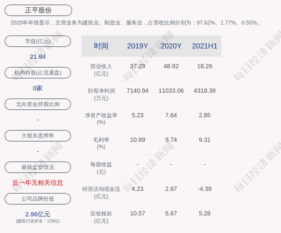 2020年年报显示,正平股份的主营业务为建筑业、制造业、服务业,占营收比例分别为:97.62%、1.77%、0.55%。