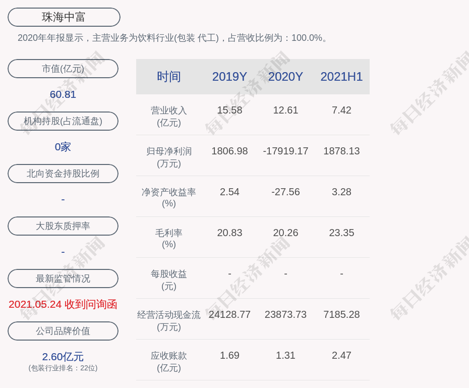2020年年报显示,珠海中富的主营业务为饮料行业(包装+代工),占营收比例为:100.0%。