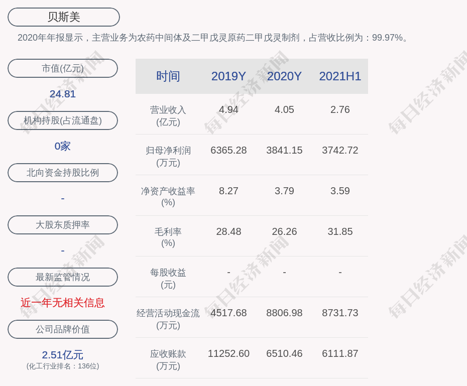 2020年年报显示,贝斯美的主营业务为农药中间体及二甲戊灵原药二甲戊灵制剂,占营收比例为:99.97%。