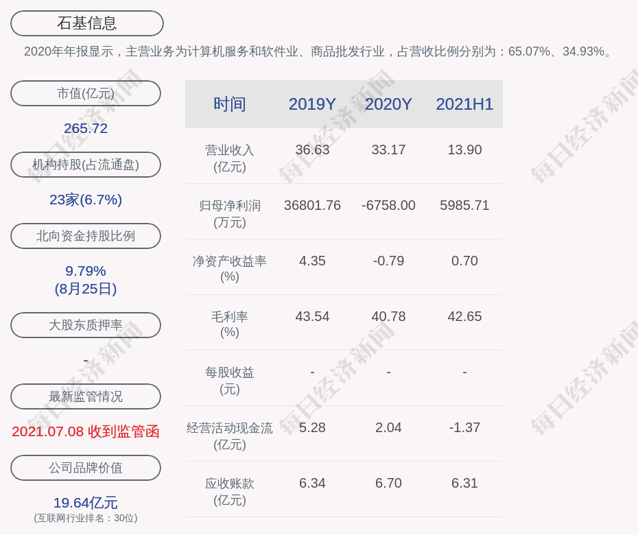 2020年年报显示,石基信息的主营业务为计算机服务和软件业、商品批发行业,占营收比例分别为:65.07%、34.93%。