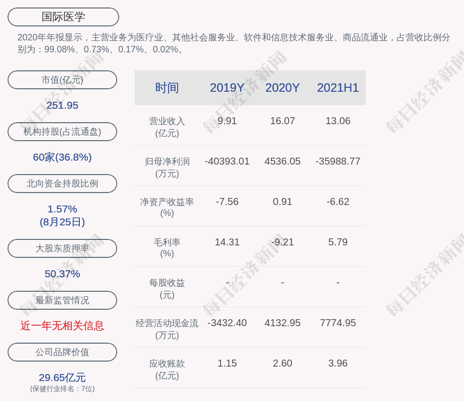 2020年年报显示,国际医学的主营业务为医疗业、其他社会服务业、软件和信息技术服务业、商品流通业,占营收比例分别为:99.08%、0.73%、0.17%、0.02%。