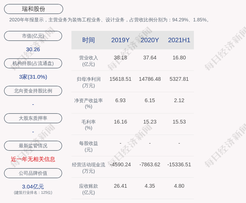 2020年年报显示,瑞和股份的主营业务为装饰工程业务、设计业务,占营收比例分别为:94.29%、1.85%。