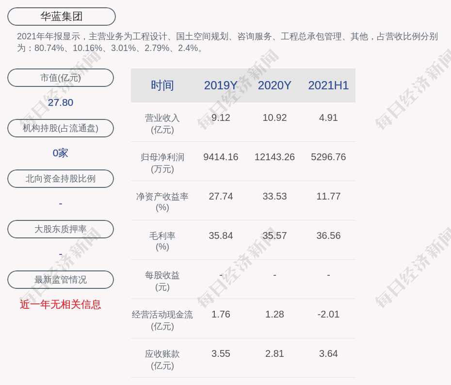 2021年年报显示,华蓝集团的主营业务为工程设计、国土空间规划、咨询服务、工程总承包管理、其他,占营收比例分别为:80.74%、10.16%、3.01%、2.79%、2.4%。