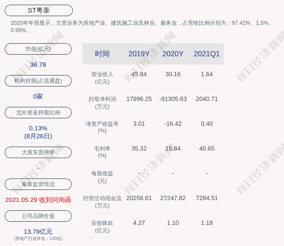 2020年年报显示,ST粤泰的主营业务为房地产业、建筑施工业及林业、服务业,占营收比例分别为:97.42%、1.5%、0.99%。