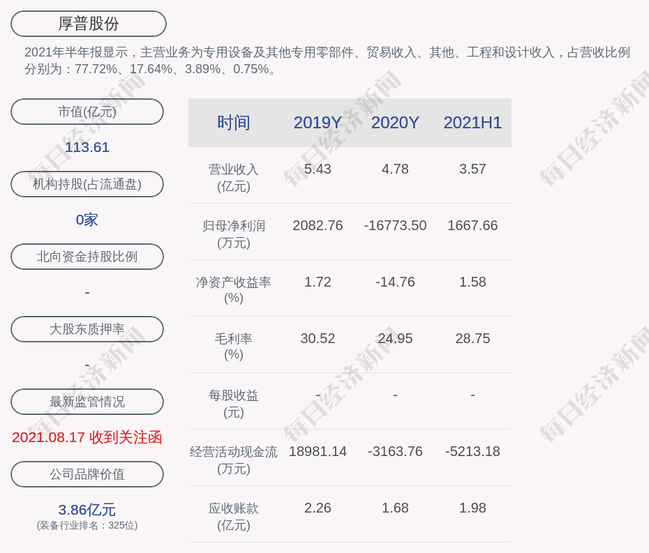 2021年半年报显示,厚普股份的主营业务为专用设备及其他专用零部件、贸易收入、其他、工程和设计收入,占营收比例分别为:77.72%、17.64%、3.89%、0.75%。