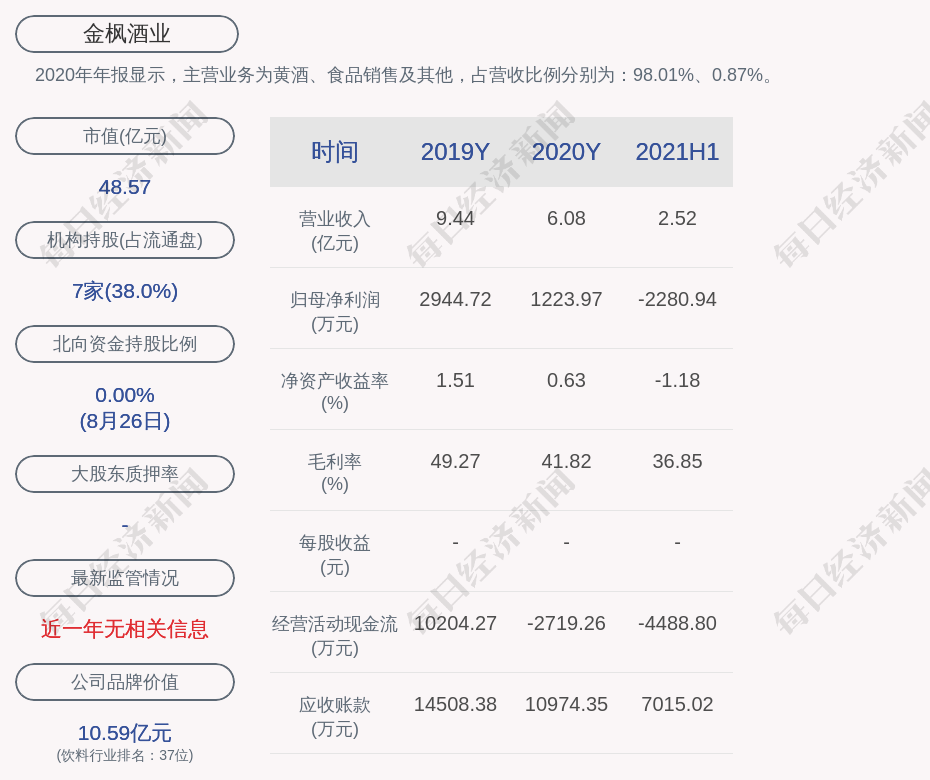 每经AI快讯,金枫酒业(SH 600616,收盘价:7.26元)8月27日晚间发布半年度业绩报告称,2021年上半年营业收入约2.52亿元,同比增加2.61%;归属于上市公司股东的亏损约2281万元;基本每股亏损0.03元。分配方案为:公司不进行利润分配、公积金转增股本。