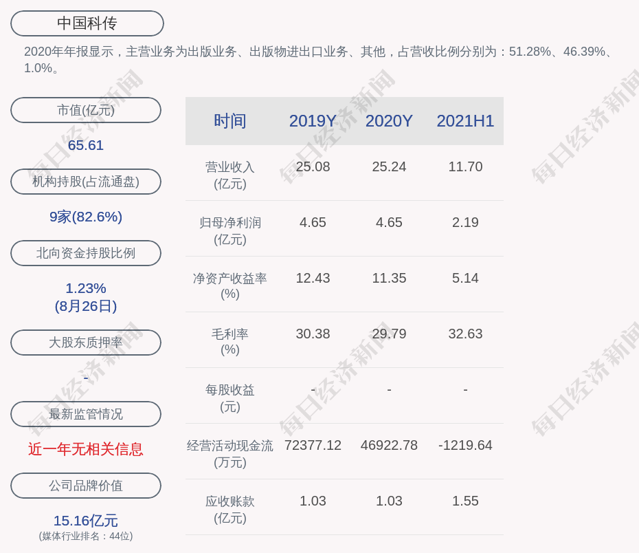 2020年年报显示,中国科传的主营业务为出版业务、出版物进出口业务、其他,占营收比例分别为:51.28%、46.39%、1.0%。