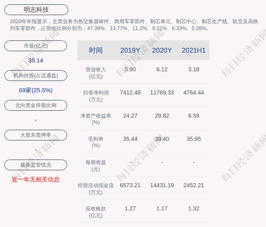 2020年年报显示,明志科技的主营业务为热交换器铸件、商用车零部件、制芯单元、制芯中心、制芯生产线、轨交及高铁列车零部件,占营收比例分别为:47.39%、13.77%、11.2%、9.21%、6.33%、5.28%。