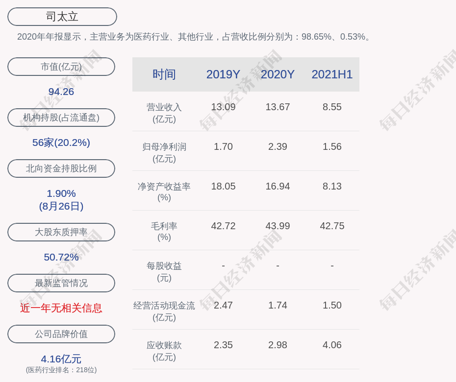 2020年年报显示,司太立的主营业务为医药行业、其他行业,占营收比例分别为:98.65%、0.53%。