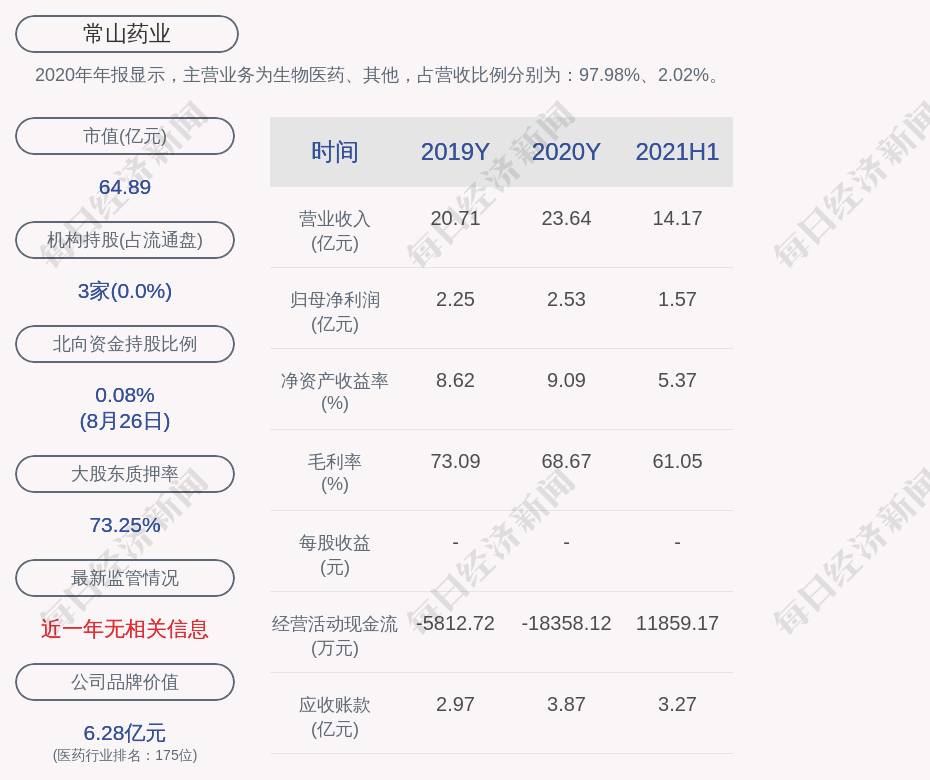 2020年年报显示,常山药业的主营业务为生物医药、其他,占营收比例分别为:97.98%、2.02%。