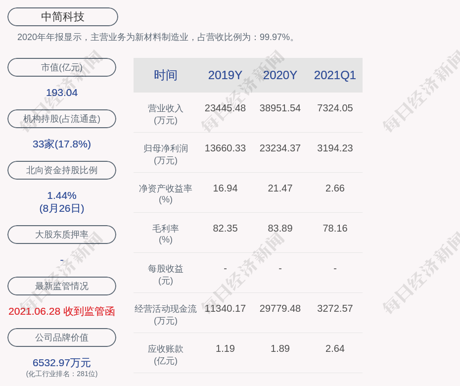 2020年年报显示,中简科技的主营业务为新材料制造业,占营收比例为:99.97%。