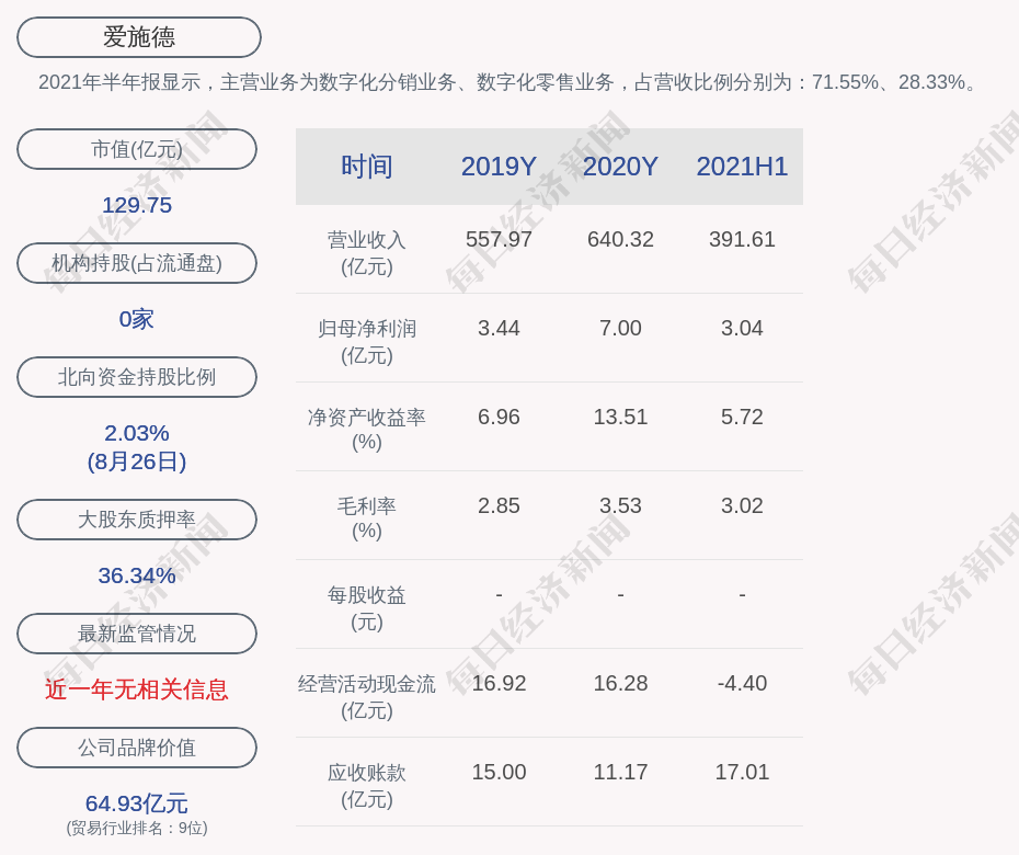 2021年半年报显示,爱施德的主营业务为数字化分销业务、数字化零售业务,占营收比例分别为:71.55%、28.33%。