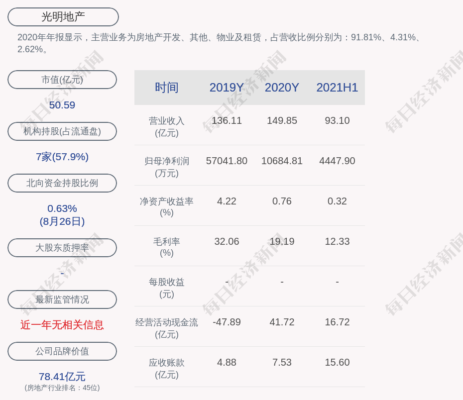 2020年年报显示,光明地产的主营业务为房地产开发、其他、物业及租赁。