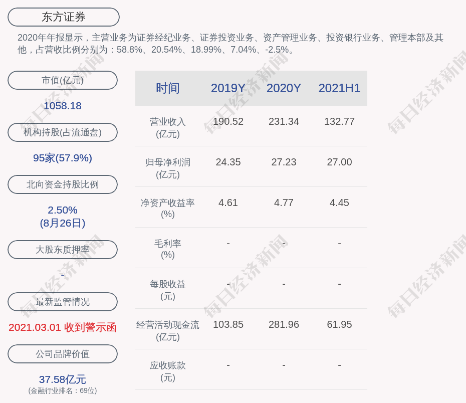 2020年年报显示,东方证券的主营业务为证券经纪业务、证券投资业务、资产管理业务、投资银行业务、管理本部及其他,占营收比例分别为:58.8%、20.54%、18.99%、7.04%、-2.5%。