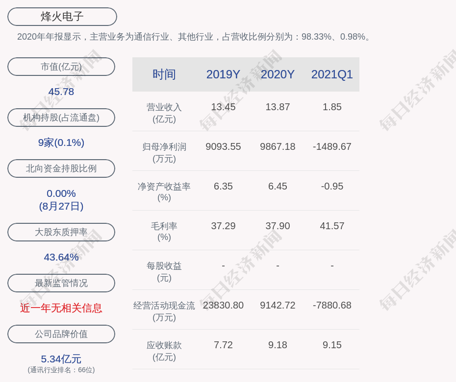 2020年年报显示,烽火电子的主营业务为通信行业、其他行业,占营收比例分别为:98.33%、0.98%。