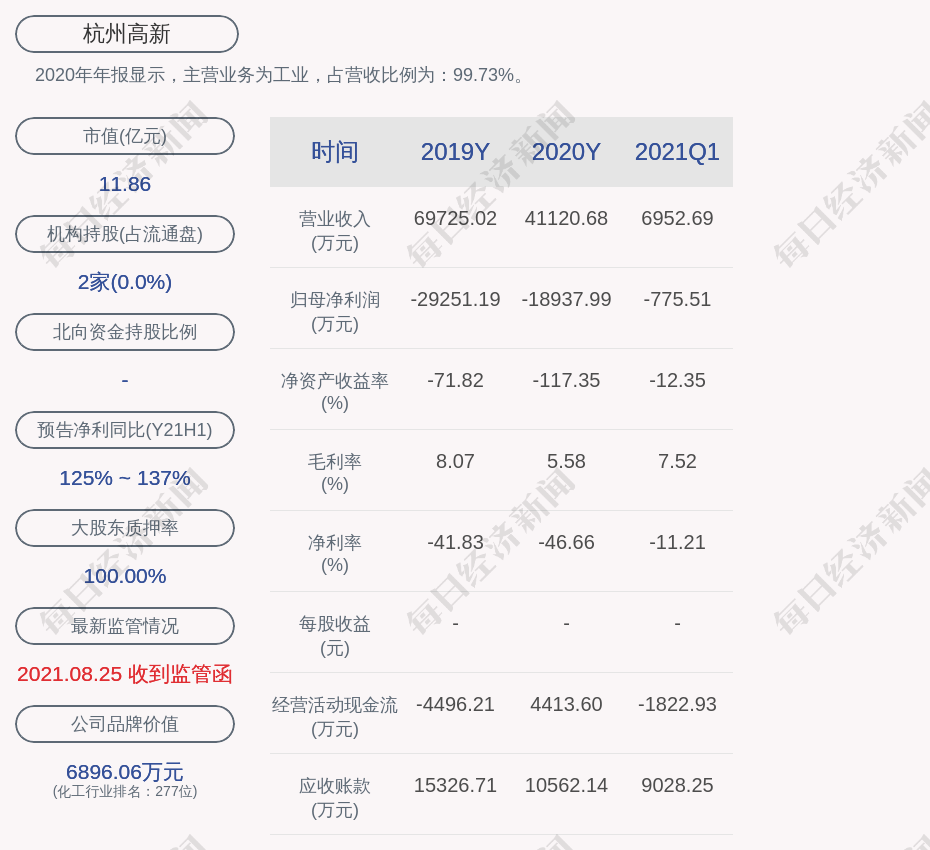 2020年年报显示,杭州高新的主营业务为工业。