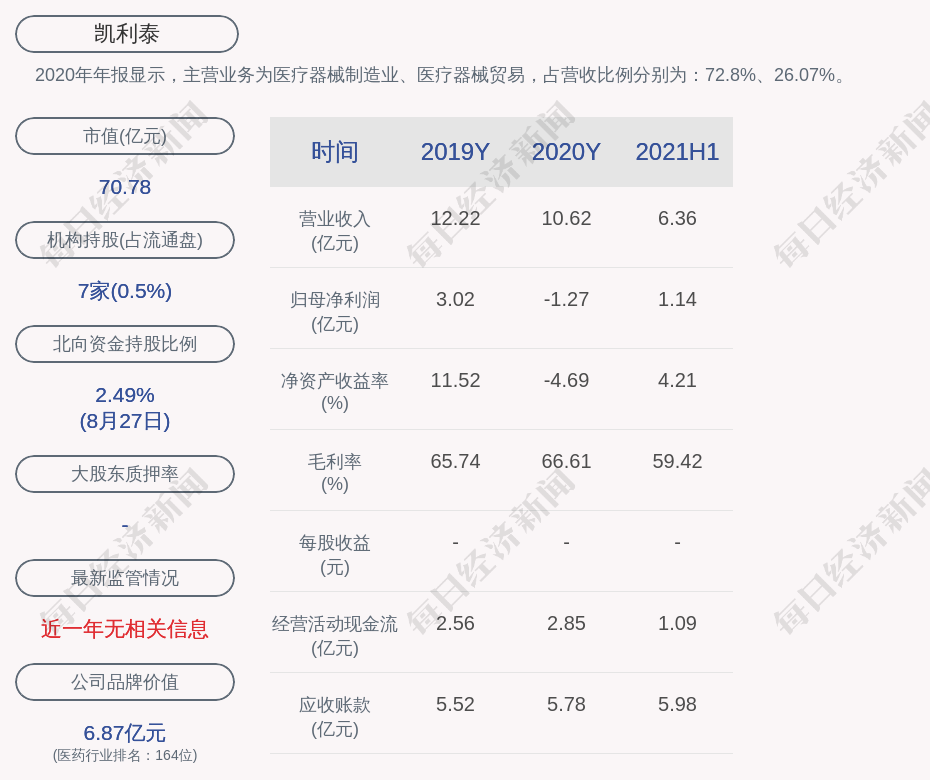 2020年年报显示,凯利泰的主营业务为医疗器械制造业、医疗器械贸易,占营收比例分别为:72.8%、26.07%。