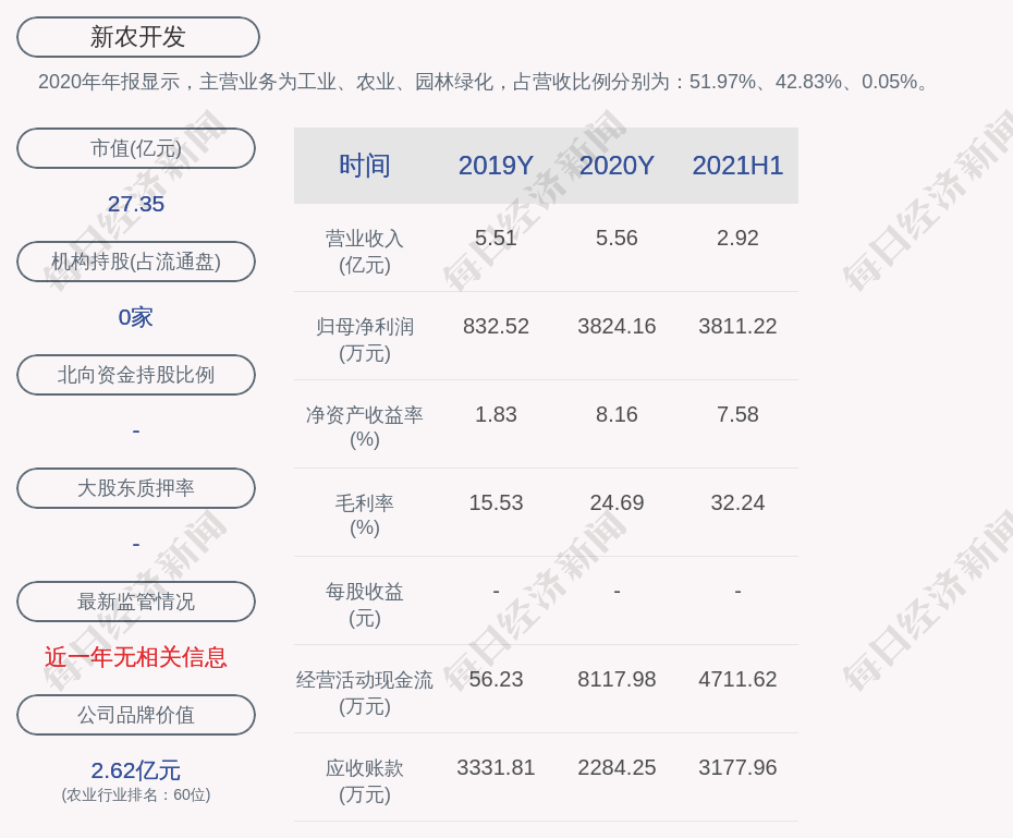 2020年年报显示,新农开发的主营业务为工业、农业、园林绿化。
