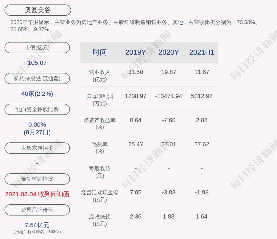 2020年年报显示,奥园美谷的主营业务为房地产业务、粘胶纤维制造销售业务、其他,占营收比例分别为:70.58%、20.05%、9.37%。