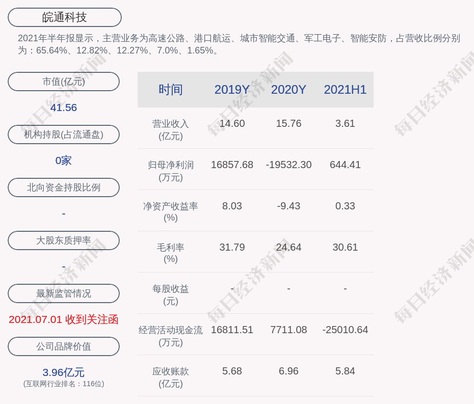 2021年半年报显示,皖通科技的主营业务为高速公路、港口航运、城市智能交通、军工电子、智能安防,占营收比例分别为:65.64%、12.82%、12.27%、7.0%、1.65%。