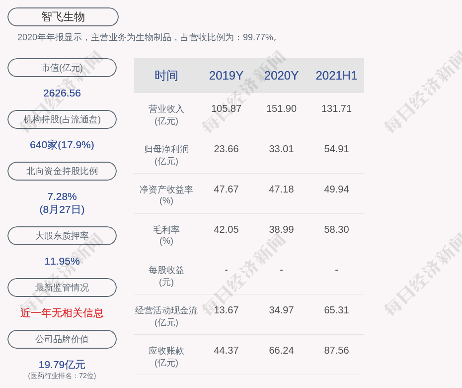 2020年年报显示,智飞生物的主营业务为生物制品,占营收比例为:99.77%。