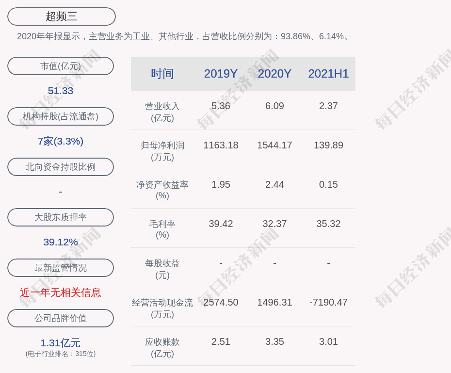 2020年年报显示,超频三的主营业务为工业、其他行业,占营收比例分别为:93.86%、6.14%。