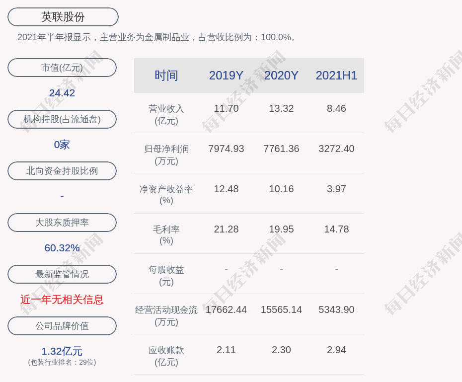 2021年半年报显示,英联股份的主营业务为金属制品业,占营收比例为:100.0%。