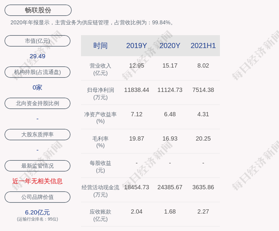 2020年年报显示,畅联股份的主营业务为供应链管理。