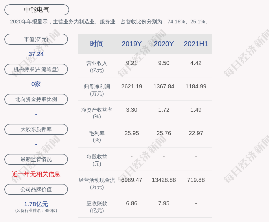 2020年年报显示,中能电气的主营业务为制造业、服务业,占营收比例分别为:74.16%、25.1%。