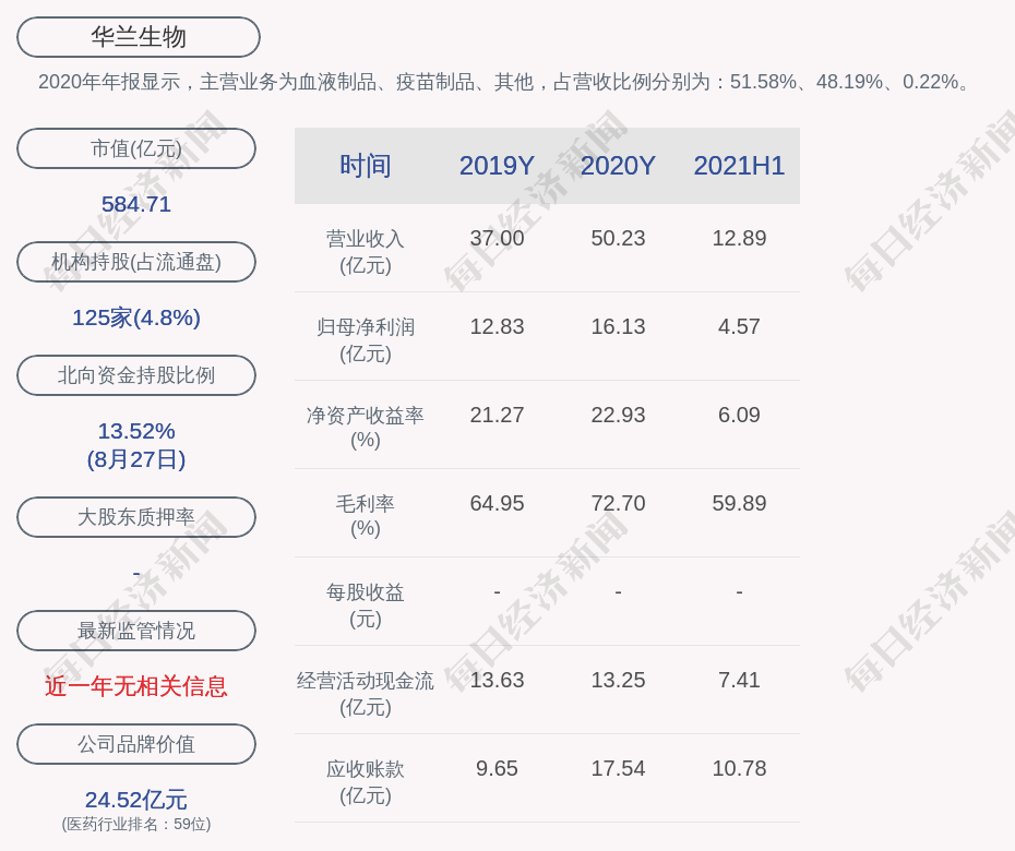 2020年年报显示,华兰生物的主营业务为血液制品、疫苗制品、其他,占营收比例分别为:51.58%、48.19%、0.22%。