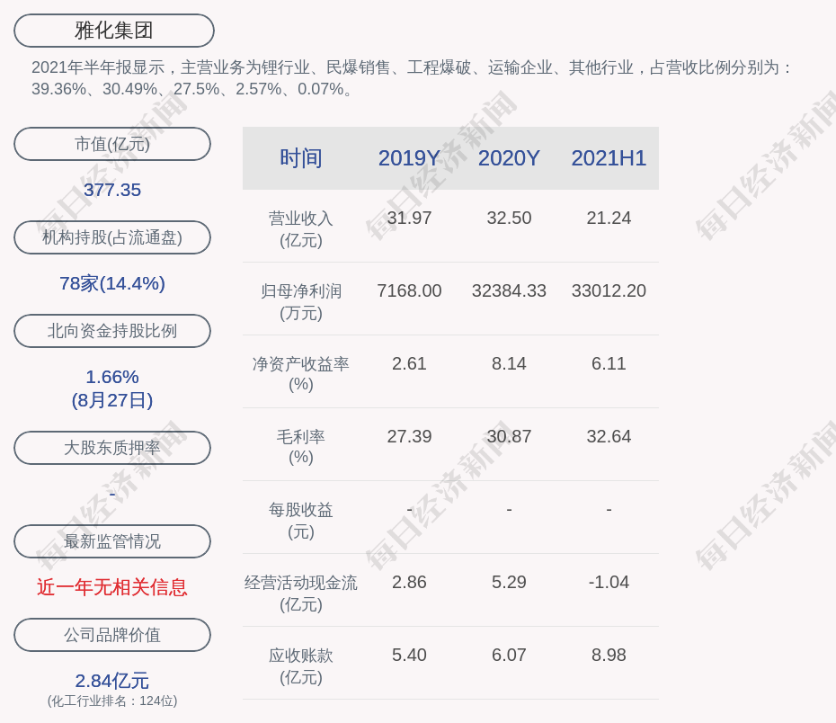 2021年半年报显示,雅化集团的主营业务为锂行业、民爆销售、工程爆破、运输企业、其他行业,占营收比例分别为:39.36%、30.49%、27.5%、2.57%、0.07%。