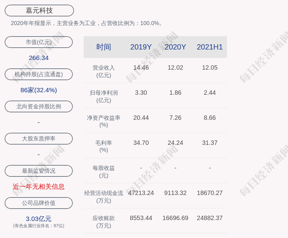 2020年年报显示,嘉元科技的主营业务为工业,占营收比例为:100.0%。