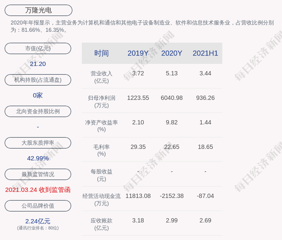 2020年年报显示,万隆光电的主营业务为计算机和通信和其他电子设备制造业、软件和信息技术服务业,占营收比例分别为:81.66%、16.35%。