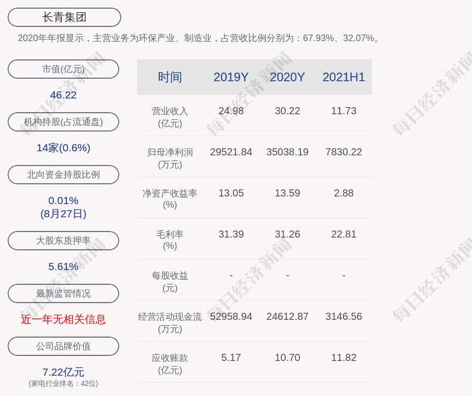 2020年年报显示,长青集团的主营业务为环保产业、制造业,占营收比例分别为:67.93%、32.07%。