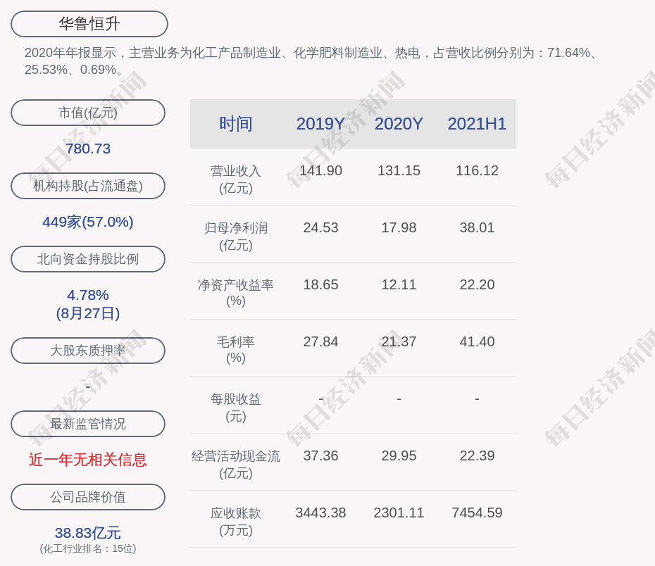 2020年年报显示,华鲁恒升的主营业务为化工产品制造业、化学肥料制造业、热电,占营收比例分别为:71.64%、25.53%、0.69%。