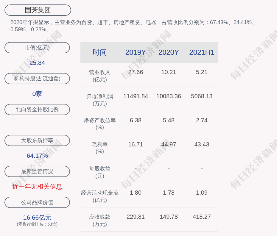 2020年年报显示,国芳集团的主营业务为百货、超市、房地产租赁、电器,占营收比例分别为:67.43%、24.41%、0.59%、0.28%。